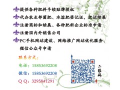 *代办肥料*授权、出租肥料登记证,肥料登记证续展、山东省内生产许可证办理、农业部菌肥及水溶肥登记证申请、肥料质检报告及委托检验协议、田间小区实验、肥料毒理检测报告、送检样品、菌种鉴定报告、肥料化验员资格证,企业标准全程办理、商标注册和续展、海内外销售公司注册、网站建设、网络推广及优化、微信公众号!