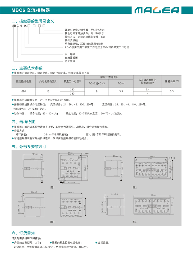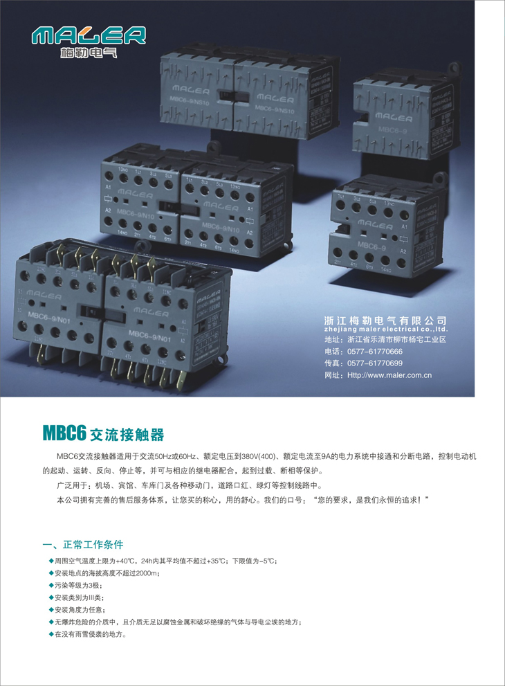浙江梅勒电气国内首家研发设计MBC6微型交(直)流接触器适用于注塑、挤压机械、门控系统、空调、压缩机、水泵、输送机械等行业,主要应用于控制三相电动机以及额定工作电压达690V AC或220V DC的电力电路。并适用于其他应用场合,如隔离、旁路、照明控制、加热器和电力机车等。
