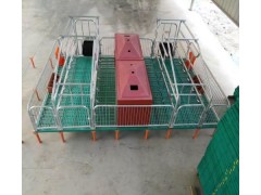 母猪产床又称高培产仔栏,主要由母猪定位架、仔猪围栏、仔猪保温箱、漏粪地板、母猪食槽和小猪补料槽等组成。 母猪定位架的作用是控制母猪自由活动区域和躺卧方式,母猪产床定位架之间有挡杠,避免仔猪被压死、踩死和压伤。定位架的长度一般为2.1-2.3米,宽度为0.6米,高度为1.0米。限位架*下边的一根栏杆上面焊有弯曲的档柱,用以保护仔猪,而不影响仔猪吃奶。母猪食槽和饮水器都在定位架的前方。