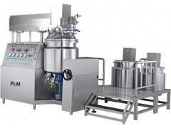 的强力剪断、冲击、乱流等过程,物料在剪切缝中被切割,迅速破碎成2um~100的微粒,由于乳化锅内处于真空状态,物料在搅拌过程中产生的气泡被及时抽走。固定式真空乳化机是在对国外进口设备进行综合消化吸收的基础上,改进研制的新型化妆品的关键设备。该设备具有快速均质、加热、冷却和真空脱气等功能。并具有均质乳化效果好(颗粒度达2um)、生产卫生条件好、热效能高、清洗方便、电器控制可靠、运行稳定、操作维修方便、劳动强度低等优点。是膏、霜、蜜类化妆品、食品、制药的理想设备