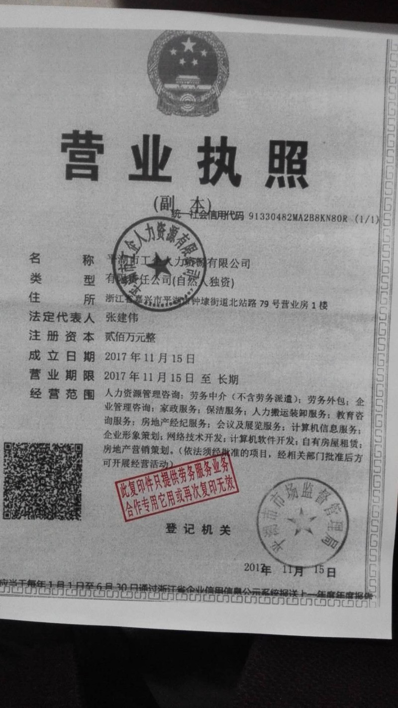 证书介绍 嘉兴平湖劳务派遣公司成立于2008年热线:15800869711是一家专业从事嘉兴平湖当湖、钟埭、曹桥、乍浦、新埭、新仓、山港、全塘、广陈、黄姑、林埭、嘉善、南湖、经济开发区、秀洲、海盐、海宁、桐乡劳务派遣、劳务外包、人事外包、生产外包、临时工小时工外包、酒店客房保洁外包、短期工外包、岗位外包、劳务输出、委托招聘、企业管理服务的企业。