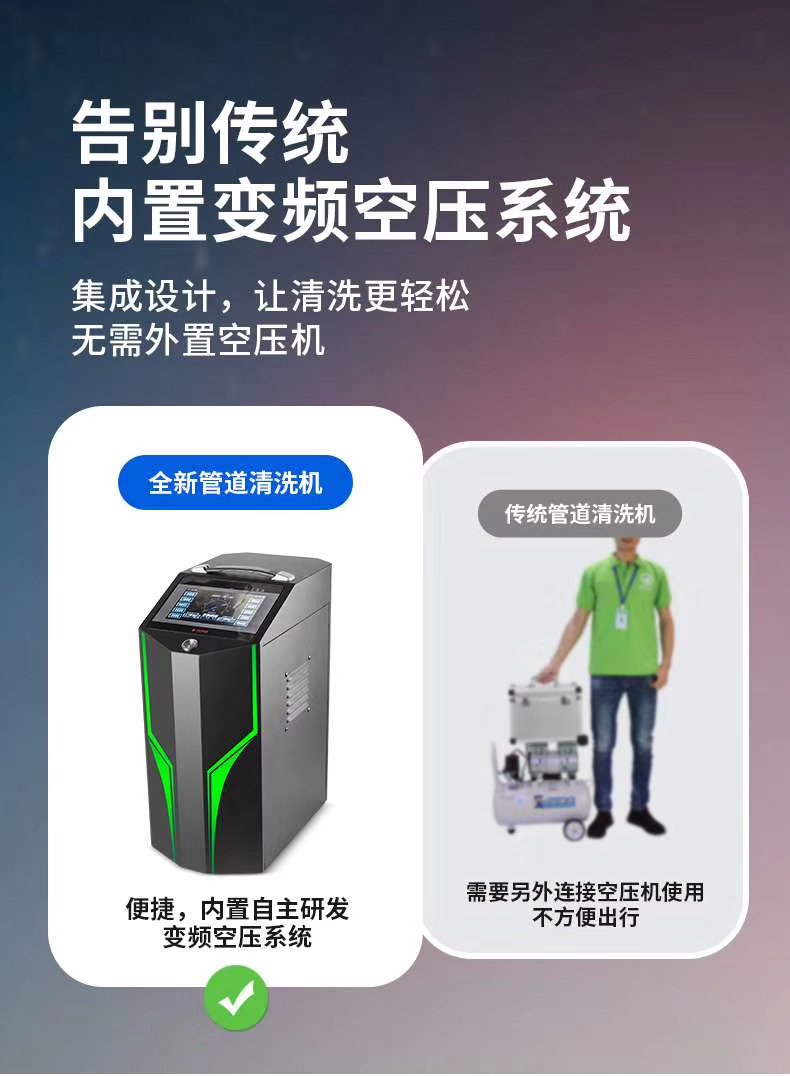 Q20 管道清洗一体机,自主研发内置变频空压系统,智能控制系统,清洗效果更高、更快、无需另外配备空压机,告别传统,携带方便。LED 显示屏,智能高清屏幕,采用 AI 智能芯片集成电路,超大高清电容触屏设计精准工作状态,体验感超强,纯铜电机 10 公斤压力高压变频,强劲动力,无线遥控、管道侧漏、强劲高周波、循环自吸、智能调节、快速散热、一体机箱,防干烧保护、压力显示、工作时间显示、别墅、厂房、酒店都可清洗。