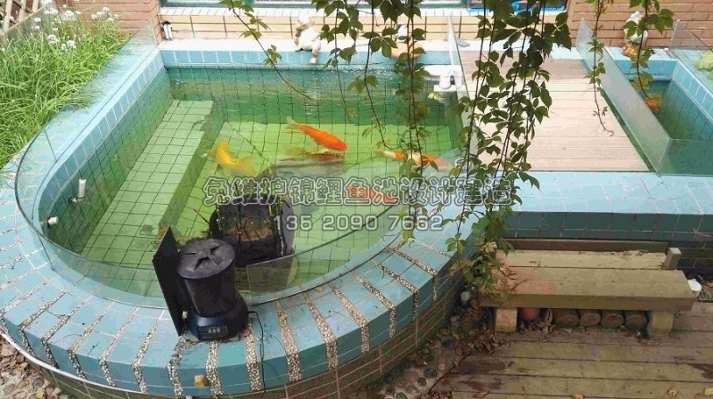 锦鳞公司设计的该款锦鲤鱼池水体8吨,鱼池外观为钢琴形状,过滤池设计在门前的小桥之下,既实用又美观。过滤池还将水体分为大小两个区域,方便将大小鱼分开饲养,两区域共用一个过滤池,十分科学。
