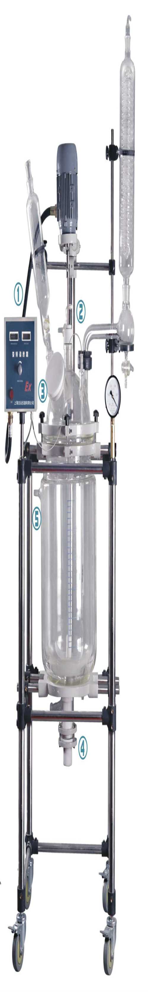 该系列双层玻璃反应器主要部分有:双层玻璃反应器釜体;双层玻璃反应器组件盖一套;冷凝器;恒压漏斗;变频控制器;旋转搅拌及密封系统;不锈钢框架系统等组成。