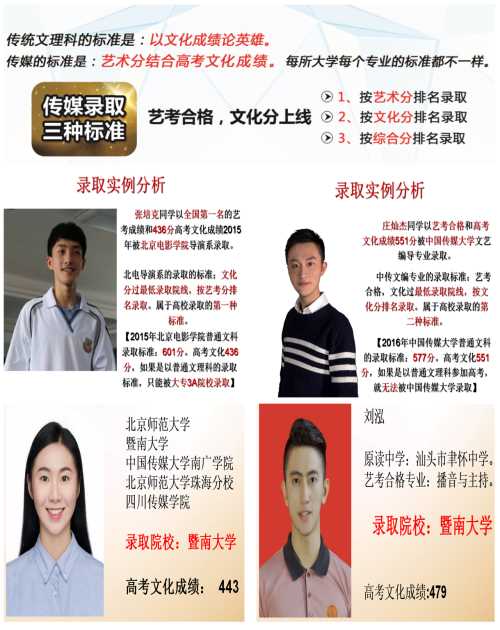 传媒录取的三种标准:1、按艺考分排名录取;2、按文化分排名录取;3、按综合分排名录取。