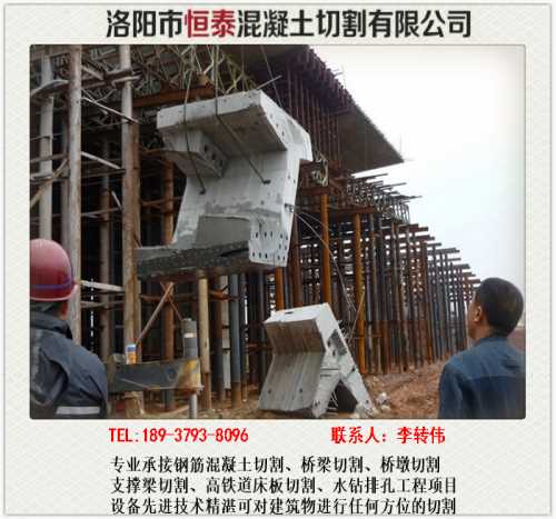 桥梁支撑梁切割工程-重庆桥墩切割施工-洛阳市恒泰混凝土切割有限公司洛阳市恒泰混凝土切割有限公司*致力于大型建筑物拆除,高速路桥梁切割拆除,跨河大桥切割拆除,支撑切割拆除,钢筋混泥土切割破碎,楼板切割破碎,高空烟筒水塔拆除,板墙切割破碎,铁路桥切割拆除,水下建筑物切割破碎,厂房框架切割拆除,承接一切高难度*拆除工程,有这丰富的施工经验,*施工团队。