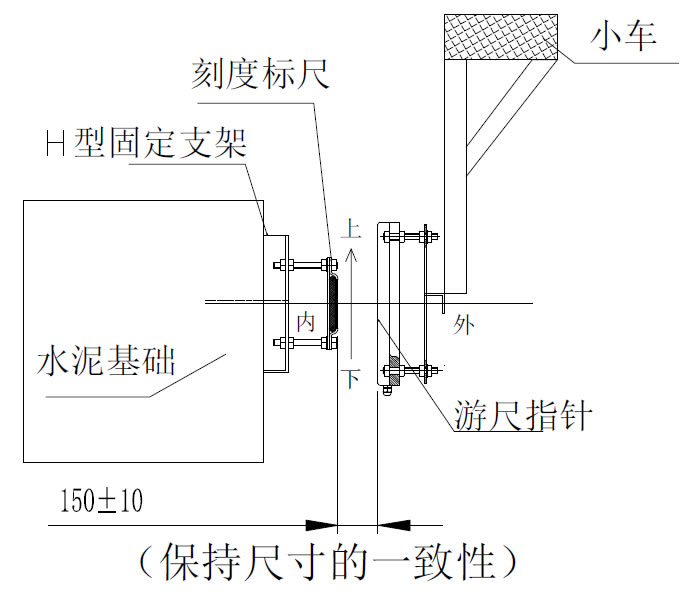 考虑到现场为环形运动机械,游尺指针安装在环冷小车上,一条刻度标尺环绕固定在环冷小车运行轨道边。