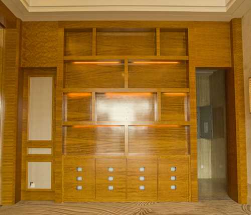 【深圳城市家具有限公司】护墙板供货案例——东莞迎宾馆护墙板木饰面于2014年7月开始供货安装,客户采用黄金影木饰面护墙板,城市家具在生产护墙板木饰面时,要考虑到木纹追纹,整栋的酒店走廊护墙板,木纹协调一致。该项目于2014年年底完成供货安装,封闭漆黄金影护墙板保留了木质天然的纹路,高端大气,该酒店为五星酒店,是城市家具五星酒店护墙板供货的经典案例。