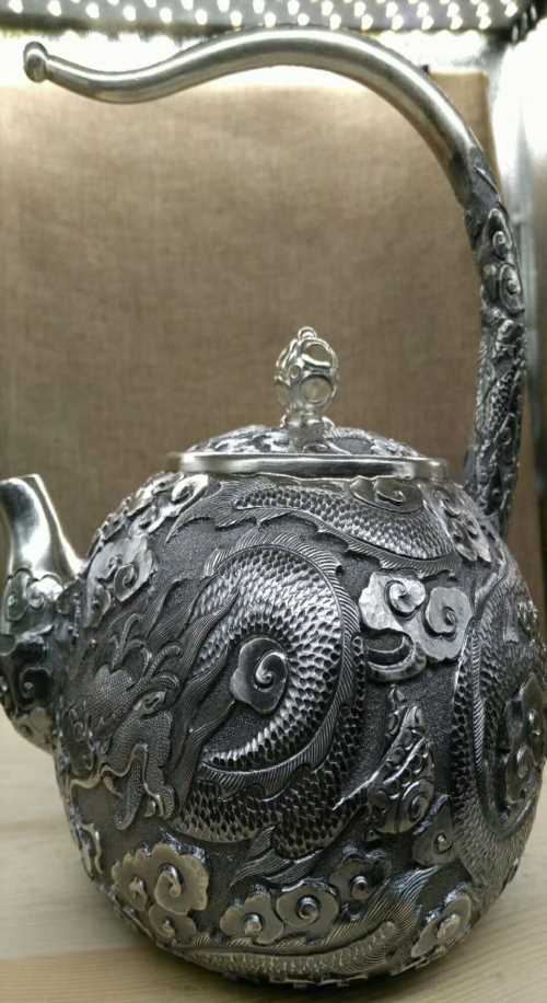 纯手工一体银壶,属于私人定制银壶,银壶嘴和银壶身是一体打的,比起焊接银壶嘴,艺术价值更高。手工打造银壶的技术难度和使用及收藏价值是机器银壶无法比拟的。手工银壶栩栩如生的图案,是银壶师傅一点一滴雕刻出来的,赋予了手工银壶生命力。