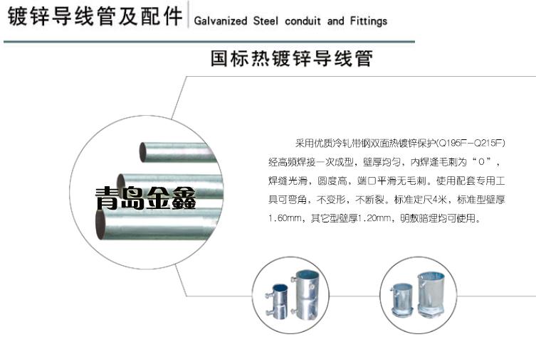 简称KBG管。导管采用*冷轧带钢,经高频焊管机组自动焊缝成型、双面镀锌而制成。管材壁厚均匀,卷焊圆度高,与管接头公差配合好,焊缝小而圆顺,管口边缘平滑。有Φ16、Φ20、Φ25、Φ32、Φ40五种规格,管壁厚度分别为1mm或1.2mm,祥见表1。导管出厂长度均为4m。