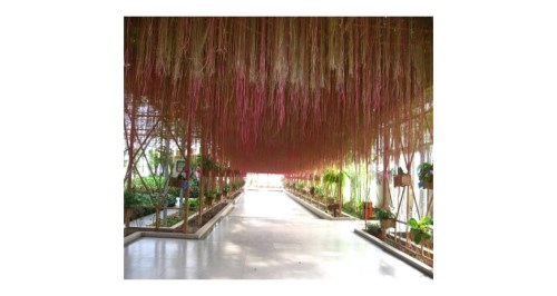 锦屏藤夏季至秋季开花,花为淡绿的白色,7月~8月会结果。*特别地方就是锦屏藤能从茎节的地方长出细长红褐色的气根,悬挂于棚架下、风格独具。