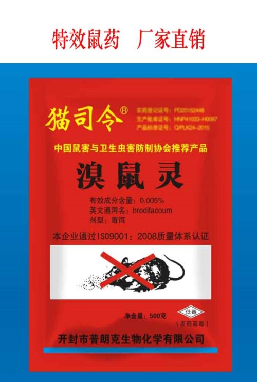 本产品为灭鼠药物,是第二代抗凝血灭鼠剂,抑制血液凝固所必须的凝血酶原的形成,然后导致中毒出血,属一次性中毒,无二次中毒现象,对各种鼠类均有致死作用。