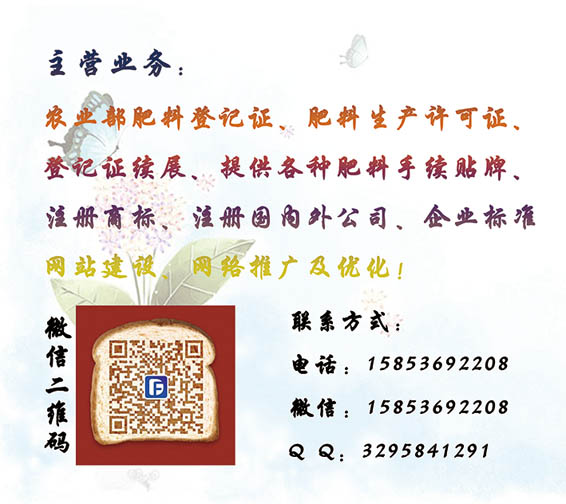 一、代办肥料登记证 二、肥料手续贴牌:充分解决当地人不认当地货问题,提供三证齐全的肥料贴牌手续供委托生产销售(各种肥料手续授权使用)三、注册商标:免费查询、免费设计 四、注册国内外销售公司(青岛、烟台、香港、英国、美国) 五、办理企业标准:企业生产的产品,没有*、行业标准和地方标准的,制定的企业产品标准 六、网站建设:企业网站、网络推广、信息发布、微商运营!