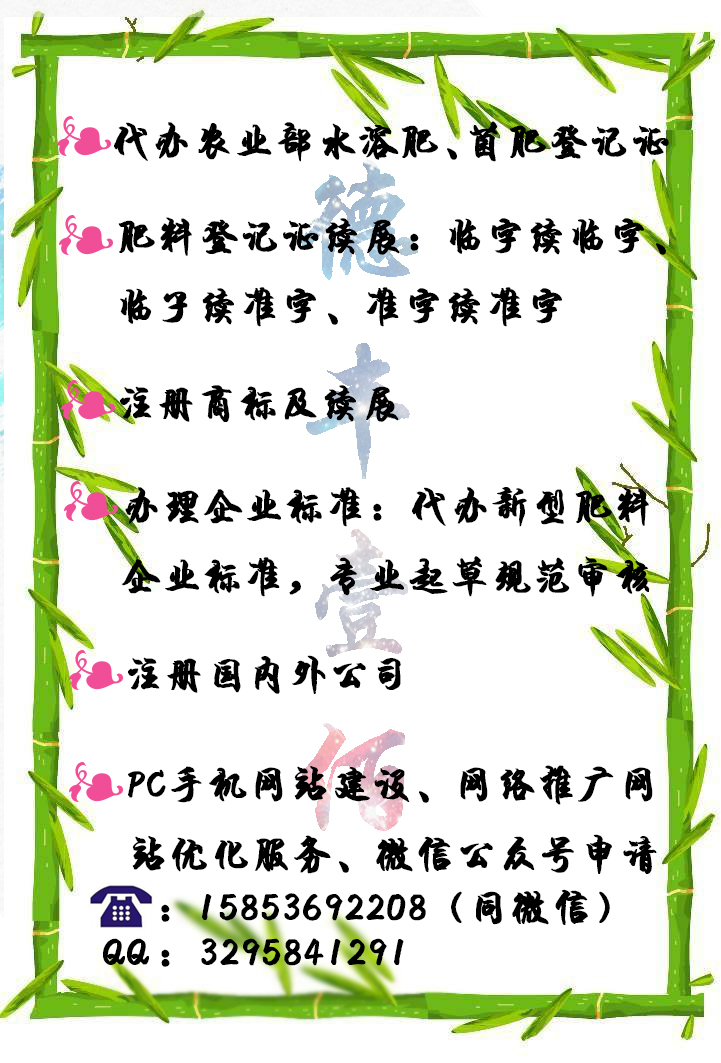 一、代办肥料登记证 二、肥料手续贴牌:充分解决当地人不认当地货问题,提供三证齐全的肥料贴牌手续供委托生产销售(各种肥料手续授权使用)三、注册商标:免费查询、免费设计 四、注册国内外销售公司(青岛、烟台、香港、英国、美国) 五、办理企业标准:企业生产的产品,没有*、行业标准和地方标准的,制定的企业产品标准 六、网站建设:企业网站、网络推广、信息发布、微商运营!