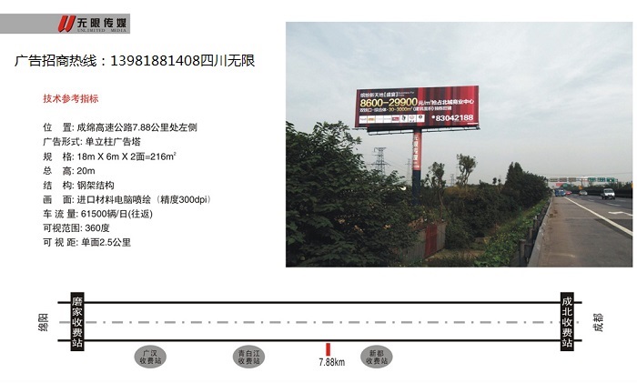 现在四川无限传媒公司在成绵高速公路等还有几块单立柱广告位,如果您有兴趣,可以联系我们,相信一定会给您的商品带来更多的受众。成绵高速公路户外广告牌的咨询热线是:139-8188-1408,诚信合作,稳健合作,互惠合作。