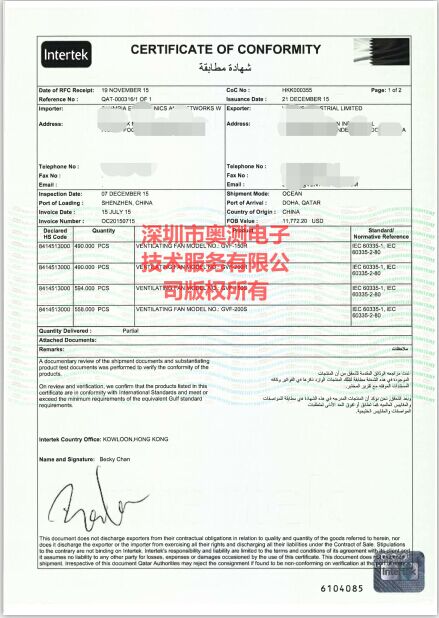 2.测试OK后!安排装船前验货:(向沙特政府授权的第三方认证机构提交产品的测试报告/质量证书、装箱单、形式*以及SASO-CoC申请表