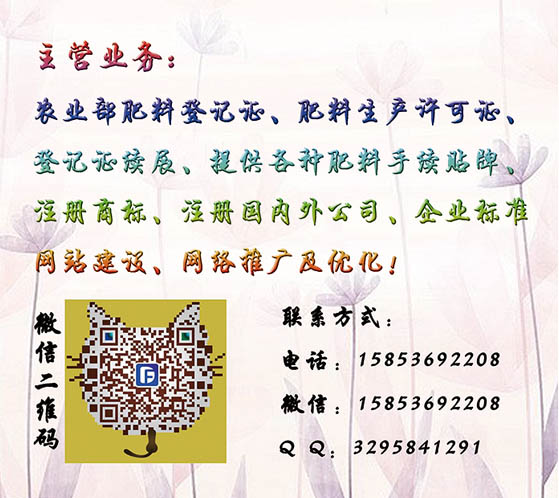 一、代办肥料登记证 二、肥料手续贴牌:充分解决当地人不认当地货问题,提供三证齐全的肥料贴牌手续供委托生产销售(各种肥料手续授权使用)三、注册商标:免费查询、免费设计 四、注册国内外销售公司(青岛、烟台、香港、英国、美国) 五、办理企业标准:企业生产的产品,没有*、行业标准和地方标准的,制定的企业产品标准 六、网站建设:企业网站、网络推广、信息发布、微商运营!