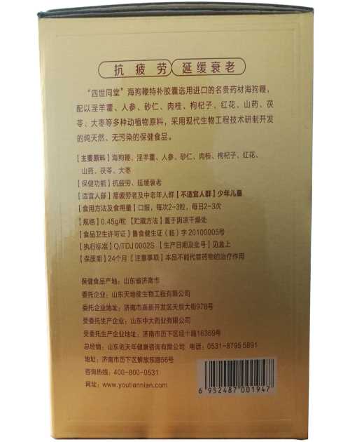 “四世同堂”海狗鞭特补*选用名贵药材海狗鞭,配以羊藿、人参、砂仁、肉桂、枸杞子、红花、山药、茯苓、大枣等多种动植物原料,采用现*物工程技术研制开发的保健食品。