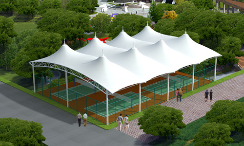 ③ 天禧膜结构景观棚能覆盖大跨度空间:膜结构中所使用的膜材料每平方米重量仅有一公斤左右,由于自重轻,加上钢索、钢结构高强度材料的采用,与受力体系简洁合理——力大部分以轴力传递,故使膜结构能跨越大空间而形成开阔的无柱大跨度结构体系。