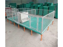 母猪产床又称高培产仔栏,主要由母猪定位架、仔猪围栏、仔猪保温箱、漏粪地板、母猪食槽和小猪补料槽等组成。 母猪定位架的作用是控制母猪自由活动区域和躺卧方式,母猪产床定位架之间有挡杠,避免仔猪被压死、踩死和压伤。定位架的长度一般为2.1-2.3米,宽度为0.6米,高度为1.0米。限位架*下边的一根栏杆上面焊有弯曲的档柱,用以保护仔猪,而不影响仔猪吃奶。母猪食槽和饮水器都在定位架的前方。
