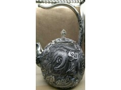 纯手工一体银壶,属于私人定制银壶,银壶嘴和银壶身是一体打的,比起焊接银壶嘴,艺术价值更高。手工打造银壶的技术难度和使用及收藏价值是机器银壶无法比拟的。手工银壶栩栩如生的图案,是银壶师傅一点一滴雕刻出来的,赋予了手工银壶生命力。