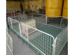 母猪产床又称高培产仔栏,主要由母猪定位架、仔猪围栏、仔猪保温箱、漏粪地板、母猪食槽和小猪补料槽等组成。 母猪定位架的作用是控制母猪自由活动区域和躺卧方式,母猪产床定位架之间有挡杠,避免仔猪被压死、踩死和压伤。定位架的长度一般为2.1-2.3米,宽度为0.6米,高度为1.0米。限位架*下边的一根栏杆上面焊有弯曲的档柱,用以保护仔猪,而不影响仔猪吃奶。母猪食槽和饮水器都在定位架的前方。